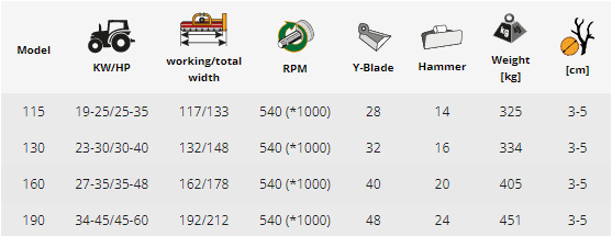 Den er beregnet på å kutte materiale med diameter opp til 5 cm, og egner seg også godt til knusing av greiner ol fra frukthager. Konstruksjonen er solid og stabil, og utviklet for intensiv bruk med mindre traktorer. En energieffektiv dobbelspiralrotor reduserer kraftbehovet, som igjen resulterer i økt ytelse og lang levetid på komponentene.